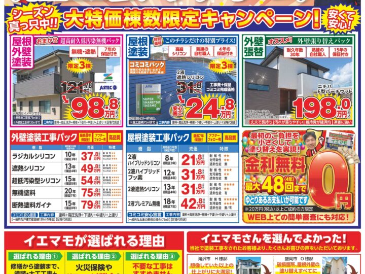 こんにちは!! 盛岡市、滝沢市地域密着!屋根外壁塗装・リフォーム専門店 イエマモのWEB担当です。 地元密着30年! 施工実績3,000件以上! 地域に密着して外壁や屋根の塗装・修繕を行ってきたイエマモから、 2025年9月30日までの期間限定キャンペーンのお知らせです。   外壁・屋根の塗装はもちろん、防水工事や屋根カバー工事、 さらには水回りリフォームまで幅広く対応している弊社は 地域に密着した「住まいに関するお悩みをトータルでサポートする」心強い存在でありたいと考えています😊     9月は「早割!大特価棟数限定キャンペーン」と題し、 屋根・外壁の塗装工事が大変お得になるキャンペーンを実施します!                       ★☆ 商品の一部をご紹介 ★☆   ①超高耐久無機塗料を使用した屋根外壁塗装パック 限定3棟で98.8万円(税込) ②人気のシリコン塗料を用いた外壁塗装コミコミパック 24.8万円(税込)から ③屋根カバー工法 76.8万円(税込) ④外壁張替えパック 198万円(税込) また、イエマモでは「最大48回払いまで金利無料」でお支払いが可能です! 急な出費が不安な方でも、月々の負担を抑えながら計画的に工事を進められます。   さらに、今回は ★☆ 住宅省エネ2025キャンペーン★☆も実施! 水回りリフォームも、特別価格でご提供しちゃいます! トイレは8.9万円から、キッチンは35.8万円から、ユニットバスは51.8万円から😊 しかも今ならまだ補助金の活用に間に合います! さらにお得にリフォームができるチャンスです。   断熱窓の交換に対しては最大200万円の補助金が利用できる場合もあり、 省エネと快適さを両立させたい方にぴったりです♪                                                                                                           イエマモが選ばれる理由は3つ。 ①施工実績の豊富さとワンストップ対応 ②火災保険やリフォーム補助金などの相談も可能 ③手抜きやごまかしのない誠実施工   地域に根ざした信頼のもと、30年以上の施工実績を積み重ねてきた確かな技術があります。 相談だけでもOK、見積もりや相談は無料。 お気軽に「チラシを見た」とお問い合わせください! これから秋冬にかけて、家の外壁や屋根の劣化が気になりやすい季節となります。 住まいの安全性や快適さを守るためにも、このお得なキャンペーンを活用してみてはいかがでしょうか??     屋根外壁塗装・リフォーム専門店 イエマモは、盛岡市・滝沢市の地域の皆様に貢献してまいります! 住所: 岩手県盛岡市みたけ3丁目18-31 店舗A 営業時間: 9:00 ~ 17:00(月~土) TEL: 0120-640-125 Webフォーム:公式サイトより24時間受付中 地域の皆様のご来店・お問合せを、スタッフ一同お待ちしております!! 【お問合せ】はこちらをクリック☆ 【施工事例】はこちらをクリック☆ 【お客様の声】はこちらをクリック☆